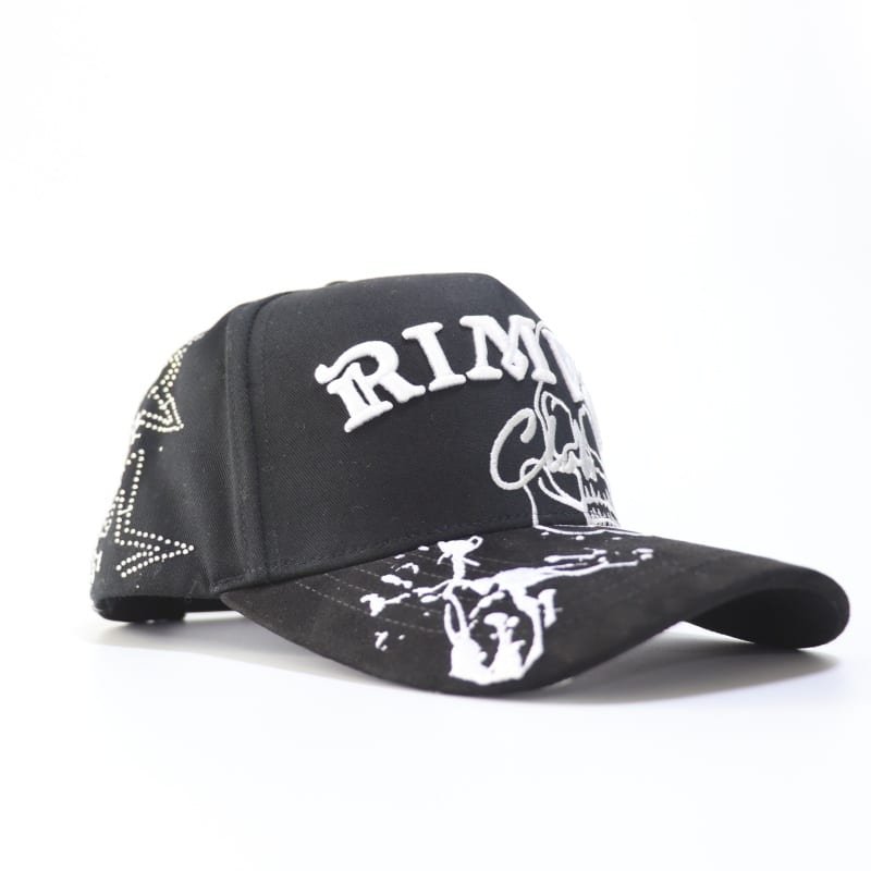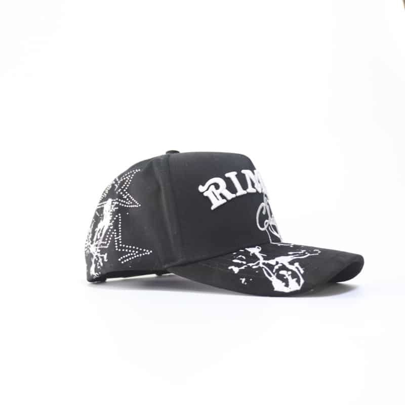 Black cotton baseball cap featuring sparkling rhinestones and a mix of 3D and flat embroidery. Stylish, durable, and eye-catching—perfect for branding, events, or everyday fashion.